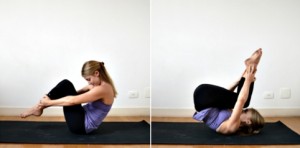 Vamos a inhalar y rodar hacia atrás hasta alcanzar la base de las omóplatos y al exhalar volvemos, empleando el abdomen, hasta quedar en equilibrio sobre los isquiones. En un primer momento, cuando somos principiantes, podemos apoyar la punta de los pies en la colchoneta hasta dominar un poco el ejercicio.