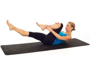 Nos colocamos en el borde de la colchoneta con las rodillas flexionadas hacia el tórax con las piernas juntas, las manos en los tobillos, los codos ligeramente flexionados y los pies lo más cerca posible de los gluteos. Nos situamos en equilibrio sobre los isquiones al mismo tiempos que llevamos la barbilla hacia el pecho alejando los hombros de las orejas.