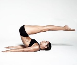 Nos tumbaremos boca arriba con las piernas flexionadas, inspiramos y elevamos las piernas formando un ángulo de noventa grados respecto al suelo, colocando la zona lumbar al suelo. Al expirar conectamos el centro y retiramos la cabeza de la colchoneta alargando la cervical. Podemos imaginar que estamos sosteniendo una pelota pequeña debajo de la barbilla. A continuación nos elevamos hasta quedar apoyados en la punta de los omóplatos. Alargamos las piernas hacia el techo y elevamos los brazos paralelos al tronco a la altura de las caderas manteniendo bien conectados los omoplatos.