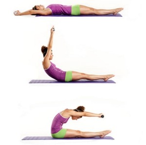 Nos tumbamos boca a arriba con las piernas juntas y estiradas, y brazos hacia atrás. Toamos aire y dirigimos los brazos hacia al techo y la barbilla al pecho, presionamos con los talones en el suelo para poder estabilizar la pelvis. Exhalamos y empezamos a incorpornos vertebra a vertebra sin lentamente hasta quedar con el tronco flexionado sobre las piernas. Inhalamos en está posición y exhalando volvemos de nuevo vertebra a vertebra a la posición inicial.