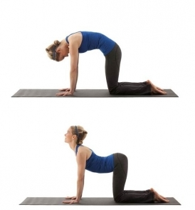 Nos colocamos a cuatro patas. Tomamos aire mientras levantamos el cóccix y la cabeza, y curvamos la espalda hacia abajo. Es normal que nos cueste mantener la parte superior de la espalda en esta posición cóncava, pero hay que trabajar para que así sea. Trabajarán todos los músculos de la columna y sentiremos como se activa la musculatura de las áreas media y superior, al tiempo que realizamos el movimiento. Los codos tienen que estar lo más rectos que podamos, y al levantar la mirada hacia el cielo, evitar tensar la parte posterior del cuello.